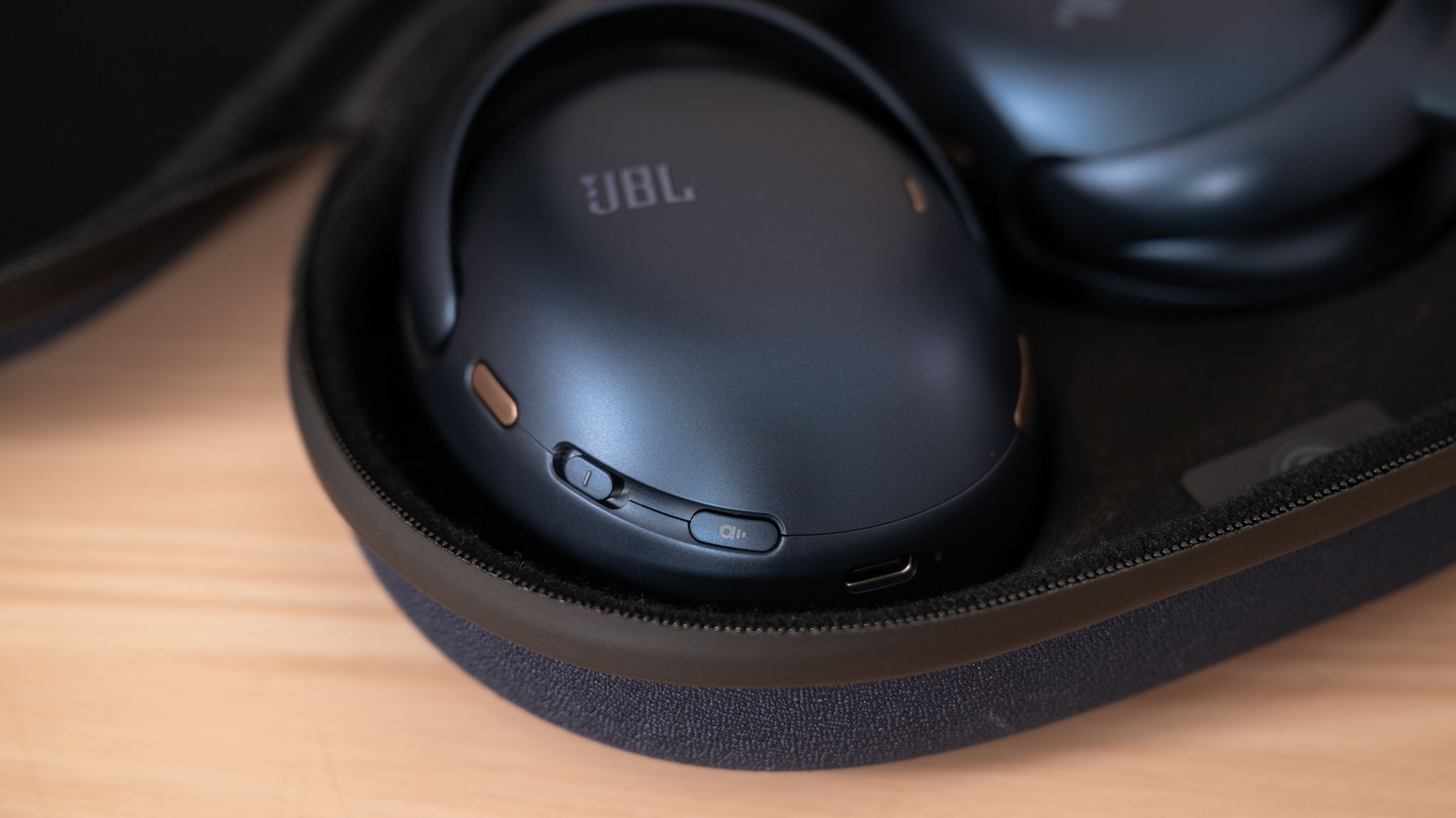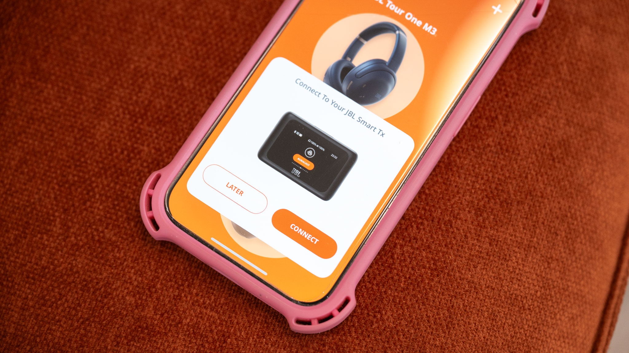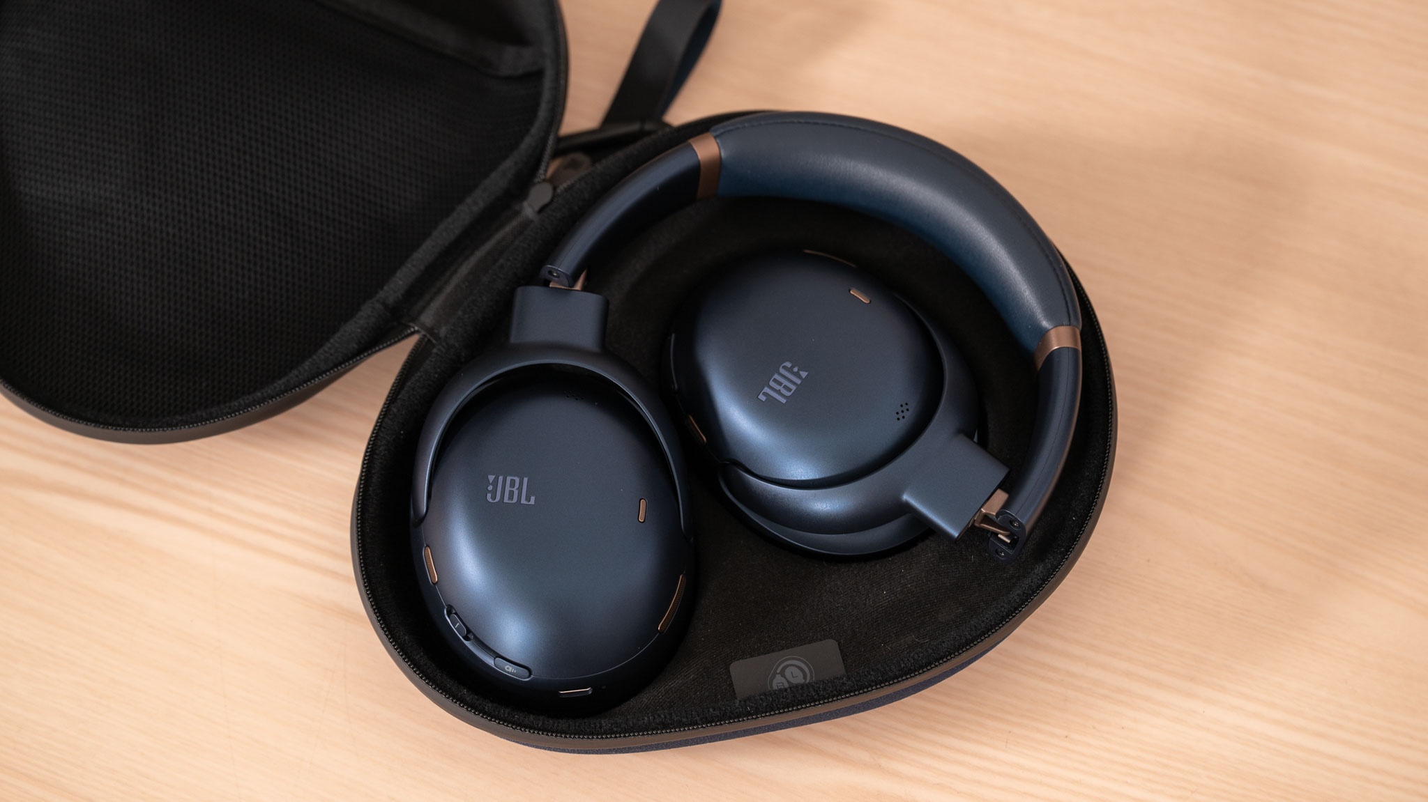 The JBL Tour One M3 has a more stylish look than its prior generation, and it doesn't have the same unpleasant odor right out of the box. They come with a travel carry case, USB-C cable, USB-C to 3.5mm cable, USB-C to USB-A adapter, and something JBL calls a “JBL SmartTX.” The Smart TX is described as a universal Bluetooth Audio Transmitter with a smart Display. JBL describes its functionality as: