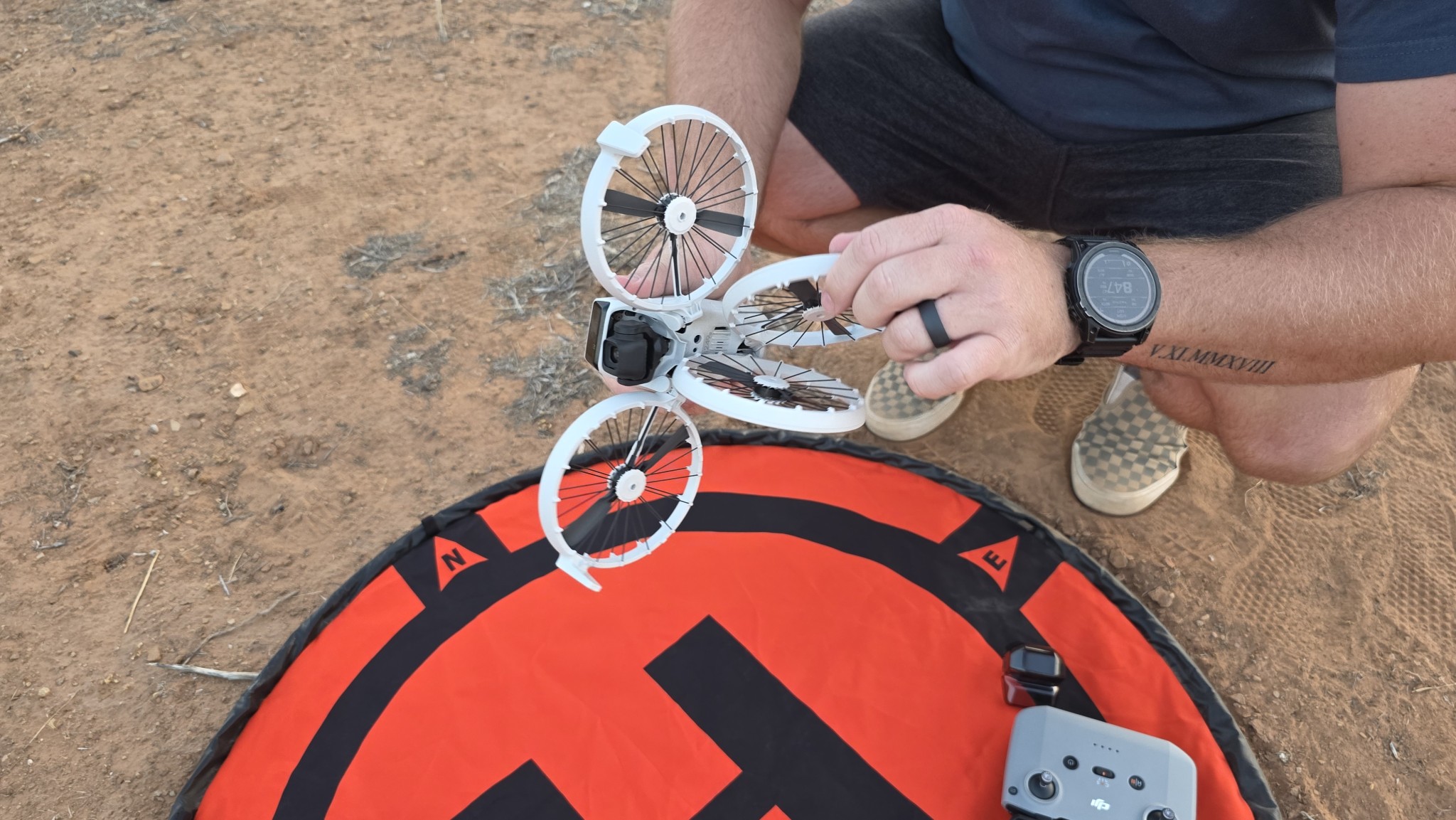The silicone cover that goes over the camera of the DJI Flip is a really tight fit, and it takes a bit more care and finesse to remove than the gimbal protection on other drones we've used. One thing to keep in mind when using the Flip is that as soon as you fold out all four of the propeller arms, it will automatically turn on, and if you're new to drones, you may not be aware that powering on a drone without removing the gimbal protection can possibly damage the camera gimbal, hurting both your drone and your wallet. Even if you're not new to drones, it seems that the Flip is particularly prone to damage when setting it up for flight because of this strange feature.