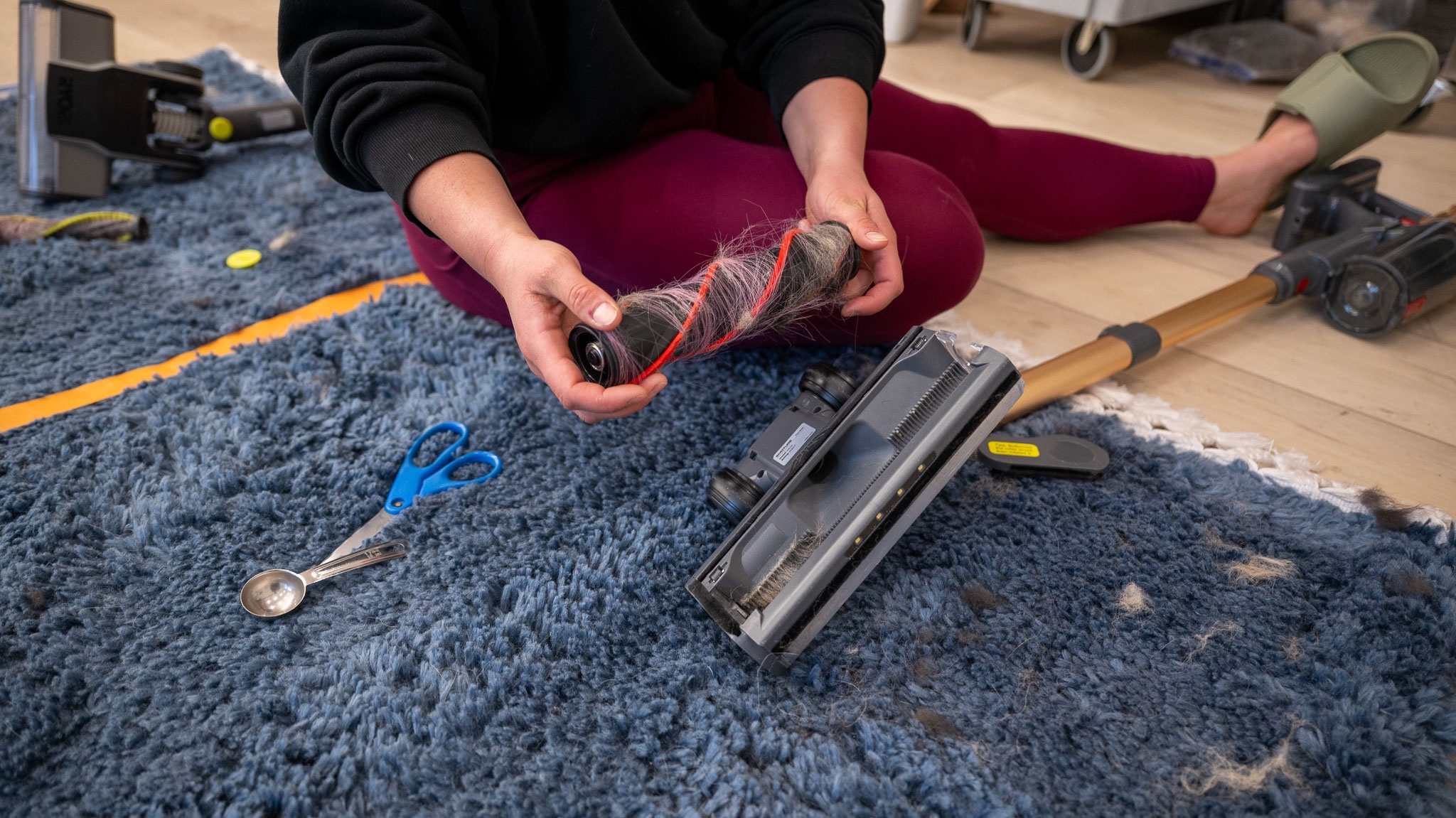 When we flipped the vacuum head over to inspect the brush roller, we found the source of the low hair pickup. The brushroller was thoroughly wrapped in long hair, and the wrap had trapped several clumps of pet hair with it. Cleaning out a hair-wrapped brushroll is one of the most tedious tasks associated with vacuuming, but fortunately, the Smoture makes it slightly more bearable by including a quick-release button, allowing you to pull the brushroll out and slide off the hair instead of having to cut it out.
