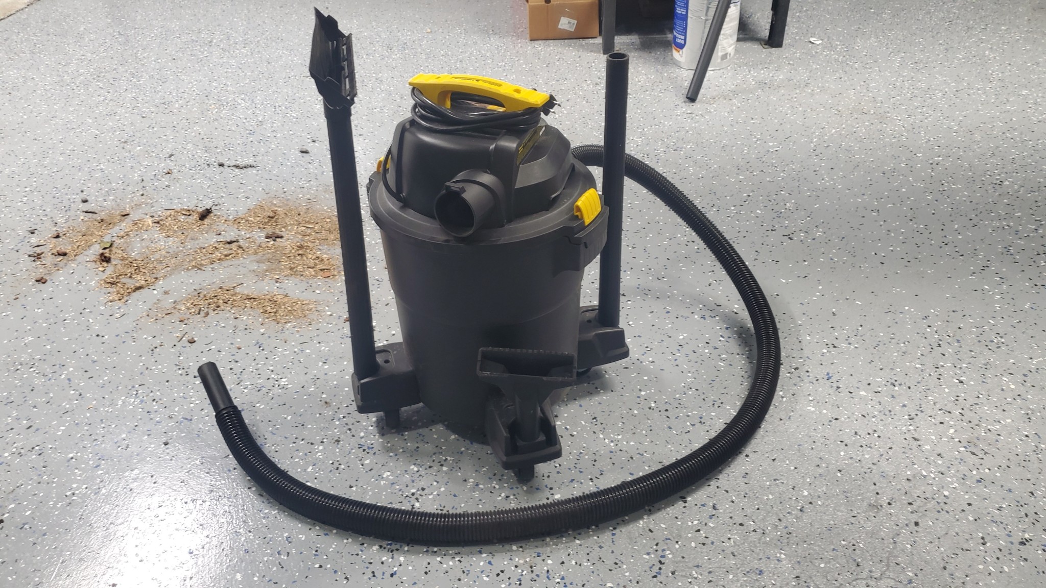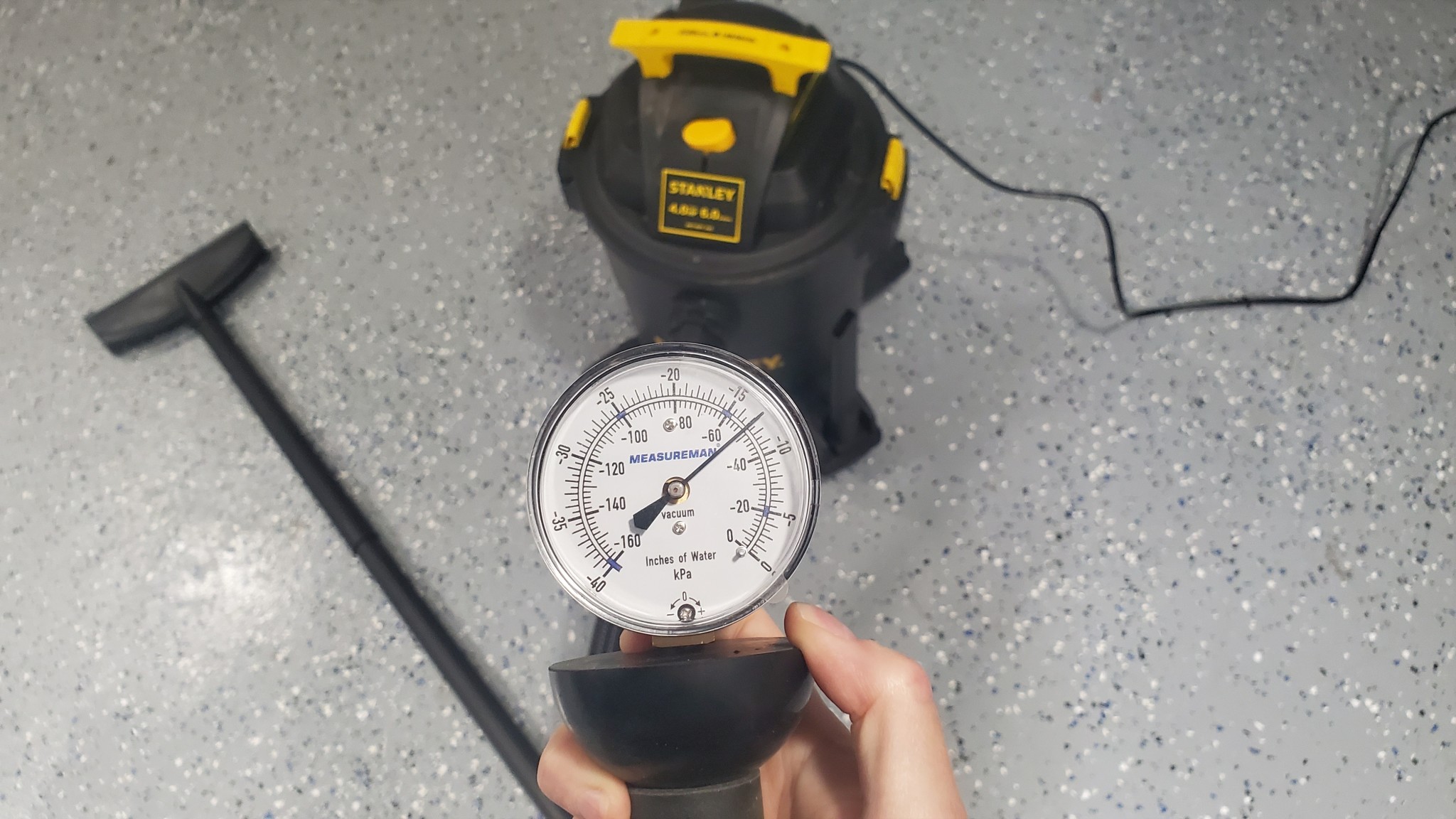 The Stanley's surprisingly high suction power translated into solid floor cleaning performance. Our dry cleanup test consisted of picking up two gallons of mixed debris, including wood chips, gravel, and bark pieces, without any attachment. The Stanley clocked a time of 135 seconds, once again being near the top of the pack for small volume shop vacs. In our wet mess cleanup, it sucked up two gallons of muddy water in 14 seconds.
