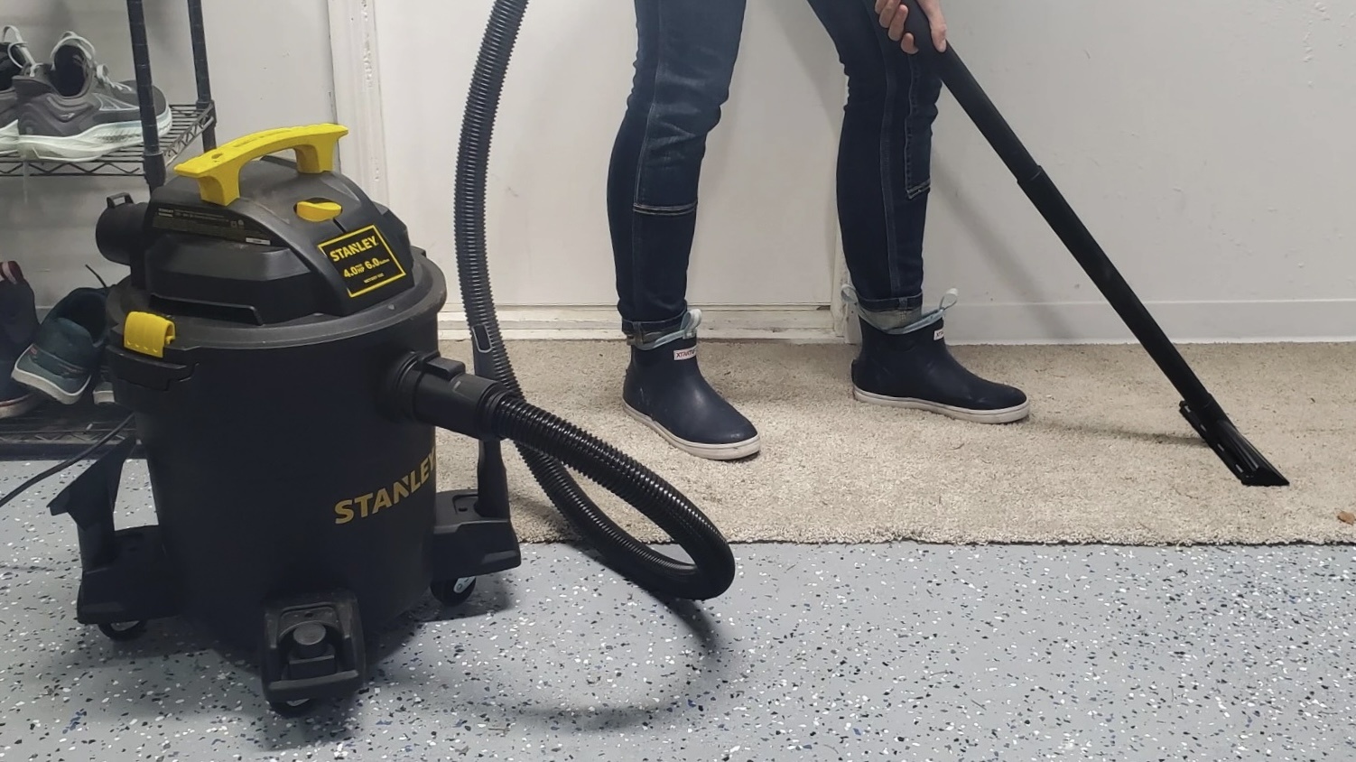 We then tested the Stanley on a variety of surfaces to test its floor cleaning performance on thick carpet, thin mats, and concrete floors. On hard surfaces and thin mats, it pulled all debris off quickly and efficiently, leaving nothing behind. But once working in thicker carpet, it often required a couple of passes to fully remove all debris from deeper fibers. For a budget option, the Stanley has adequate floor cleaning capabilities that left us satisfied for most projects. However, if you're regularly cleaning up big messes or in thick carpet, it might lack that higher-end performance found in a more expensive option.