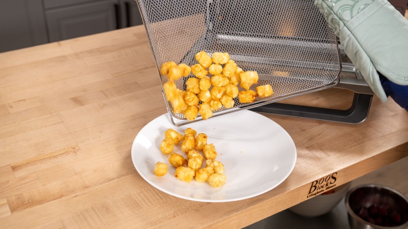 The chicken thighs emerged particularly impressive, with crispy, golden-brown skin and juicy meat that registered the proper internal temperature. We appreciated being able to roast the chicken in one compartment while our tater tots crisped up in the other, effectively preparing an entire meal in one appliance. The tater tots achieved a satisfying crunch, though not quite as crispy as what we've experienced in dedicated air fryers.