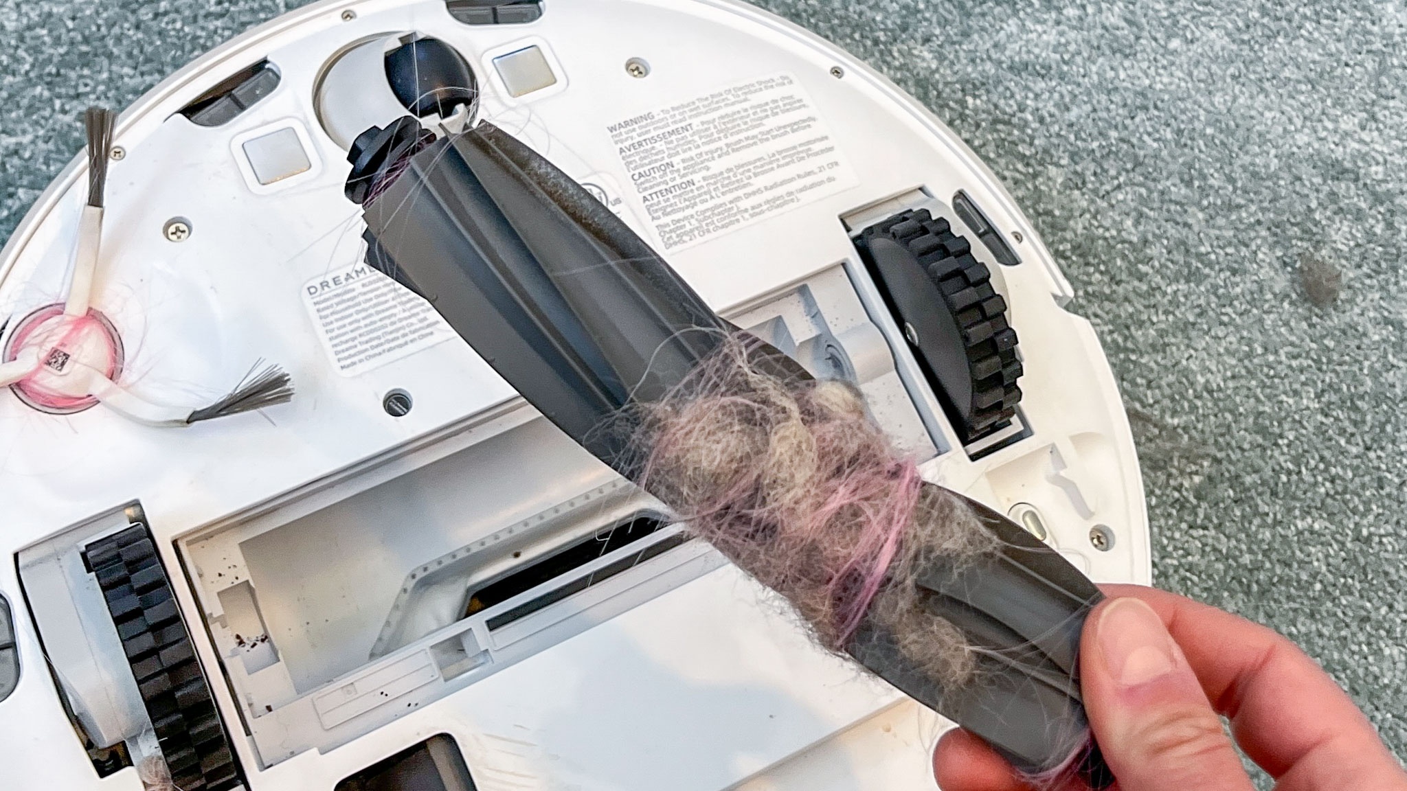 The DREAME D10 Plus Gen 2 put in a valiant effort on pet hair but fell short of fully clearing carpets. It managed to pick up most long hairs and avoided major tangles around the brush roller, which was a pleasant surprise, but several clumps were left behind.