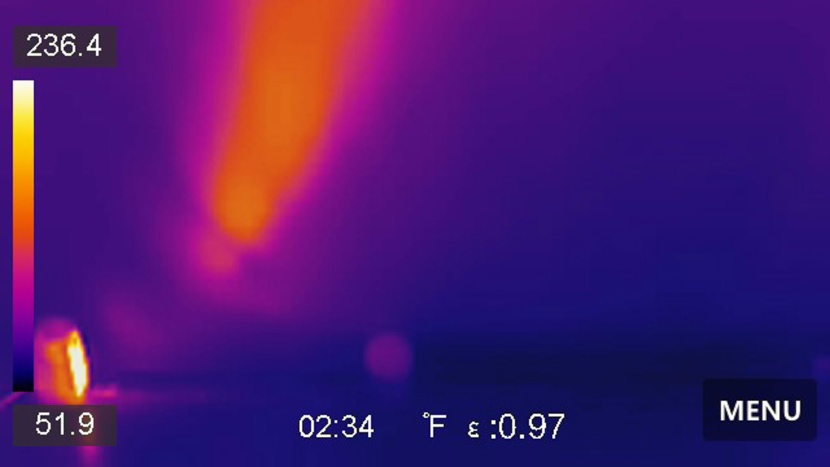 Following our first Direct heat test, we turned every heater perpendicular to our test sheet, and again, through the thermal camera, we observed how far each heater could blast heat from the front of its grille. At this point, we also began to understand each product's hazards by observing whether they created hot spots on the ground before them. After finishing both tests, we could finally compile and add all data points to give each heater a Direct Heat Score.