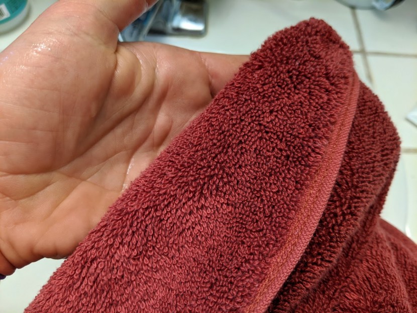 Unfortunately, these towels take quite a while to dry. We hung them out in the dry desert air for 90 minutes, and at the end of their time on the line, they were still a bit damp. Compared to other towels of similar material and size, this set held onto water longer than we'd have liked. Also, these towels showed a few minor signs of unraveling early in the testing process.