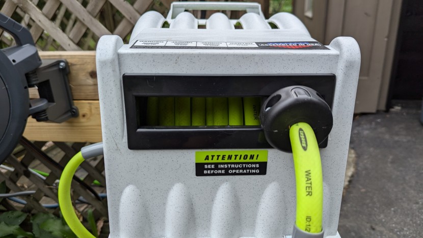 Reels that unwound smoothly, without requiring a lot of force, were ideal; we didn't feel like we were fighting them the whole time. Additionally, latching zones that were both audible and tactile, meaning you could feel the clicks through the hose vibrations, were helpful for not pulling through the zone and starting automatic retracting. Reels that combined those sensations along with frequent zones were the most intuitive to use. Most retractable reels tended to bounce around a little, given their single tube connection to their mounts that let them pivot freely. We ensured the hose worked at all angles of the rotation. We tested this on manual reels as well, though many models don't rotate. We also evaluated whether the manual reels were sturdy enough to put up with the weight of a full hose and the force of cranking down on the reel to wind a hose up.