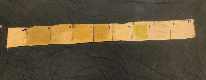 The stain strip was utilized for the Tide Impossible Stains before washing. The stains from left to right include: (1) control, (2) red wine, (3) grass, (4) mustard, (5) mud, (6) Coffee, (7) unused motor oil, (8) vegetable oil, (9) Cocoa