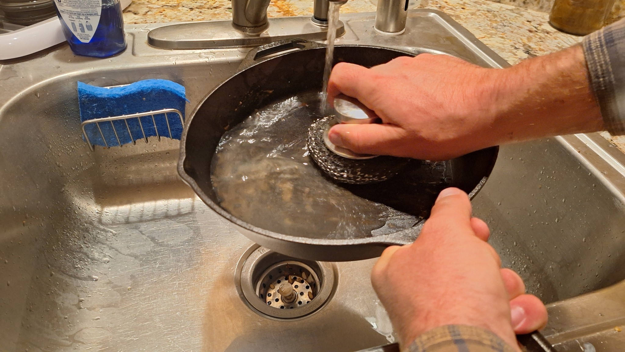 Don't be afraid to take steel wool and a touch of soap to cast iron! Credit: Dominik Bleeg