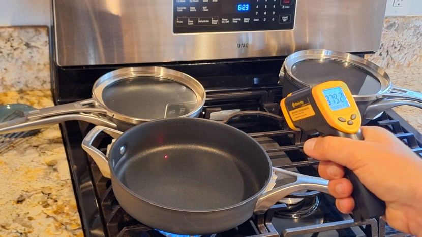 To test the cooking evenness of each set, we put each on medium heat for 3 minutes and used an infrared temperature gun to measure temperature differences on the pan. Evenly distributed heat on a pan will help ensure a quality sear on meats or help you serve up that perfectly cooked pancake. In general, nonstick sets with thicker gauge metal used and an aluminum core offered the best cooking evenness. Stainless steel is also great with thinner materials, while cast iron is typically not as good.