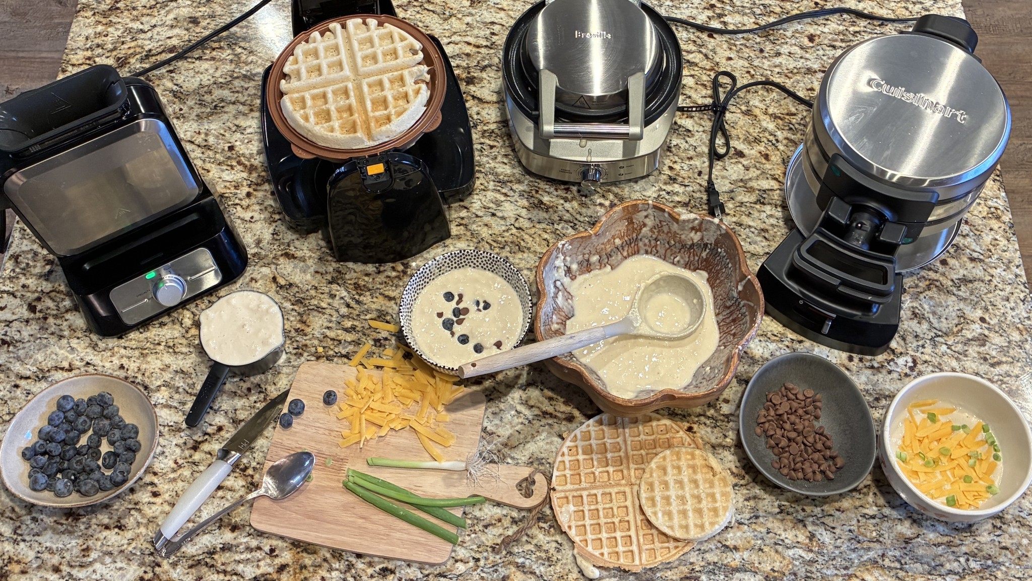 It's ideal if a waffle maker can handle a wide range of mix-ins, like blueberries or chives. We found that in general, the flip-style waffle makers handled mix-ins the best, cooking evenly and with the least amount of mess. The Breville No-Mess tended to smash any mix-ins, and in the vertical makers, mix-ins often floated to the top, leading to a lopsided waffle.