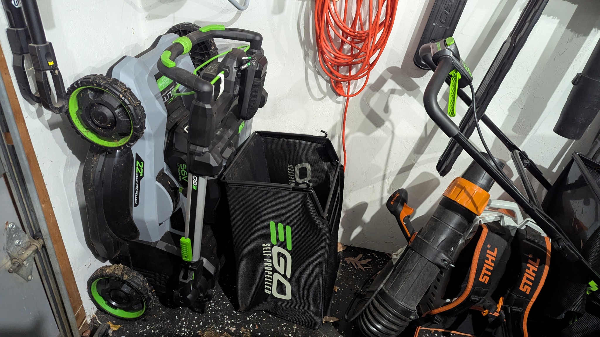We love that battery mowers can be folded up and stored on end. This is a drastic change from your dad's old gas mower than takes up a giant chunk of the garage. Credit: Clark Tate